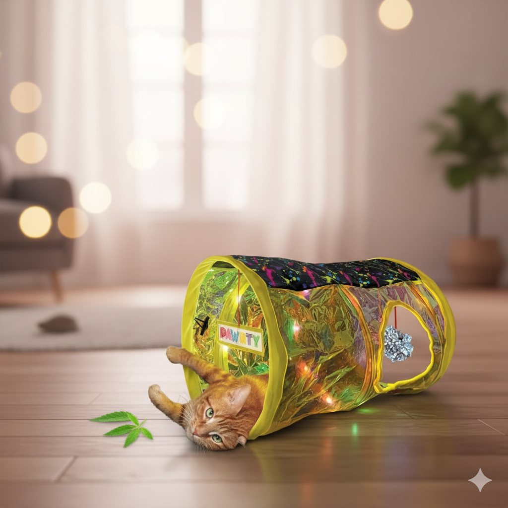Get The Cat TunnelLet your kitty roll, hide, and pounce in style! The Pawtty Cat Tunnel glows with colorful LED lights and features crinkly textures